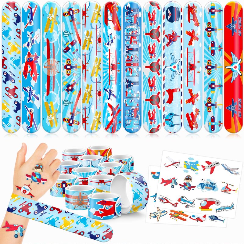 48PCS Airplane Party Favors 24PCS Tattoos 24PCS Slap Bracelets Wristbands Themed Birthdays Party Supplies Decorations Decor Pattern Girls Boys Gifts School Classroom Prize Carnival Christmas Reward