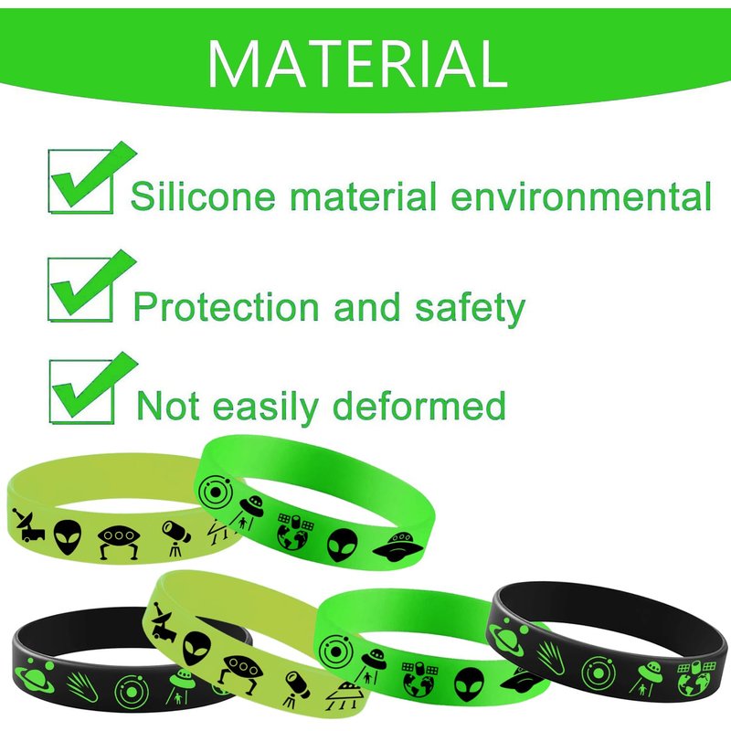 - Image design - This Green Alien party themed rubber bracelets are printed with image of "Green Alien","Planet"," Earth", etc..Funny hand accessories that make you stand out among people in party or celebration.
