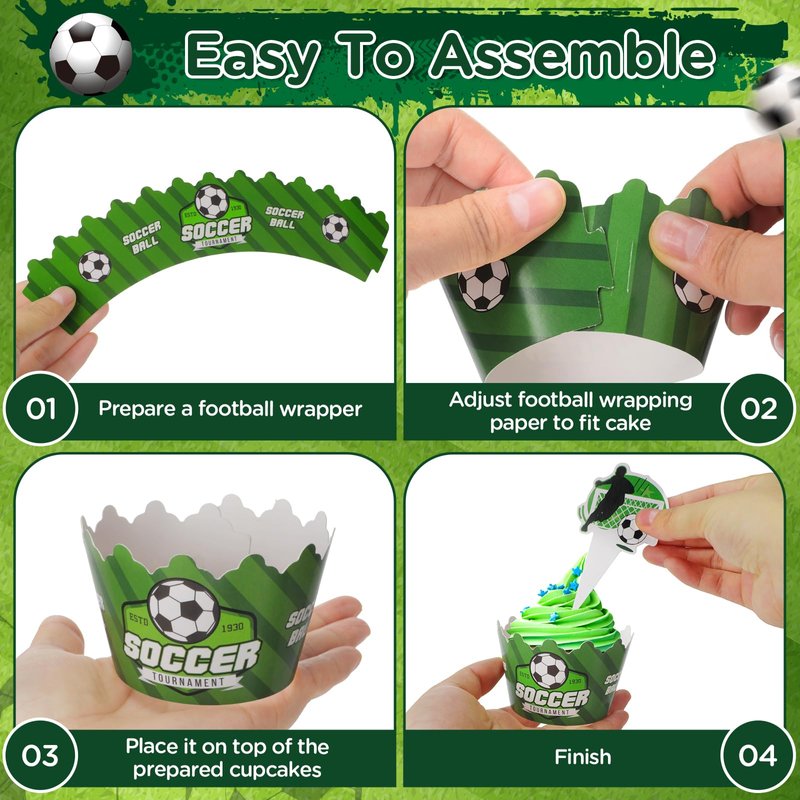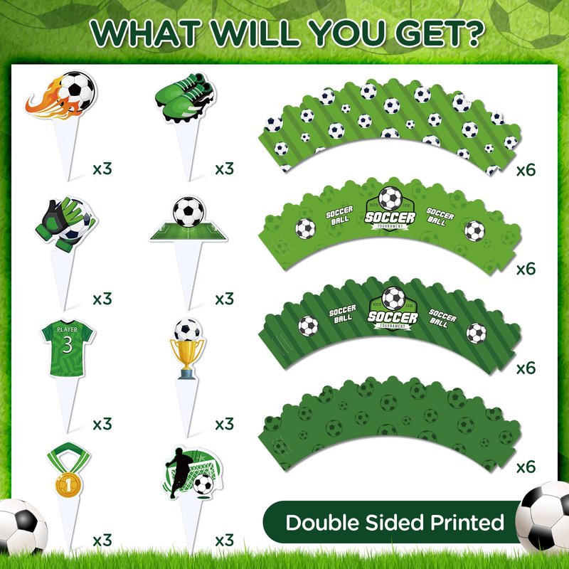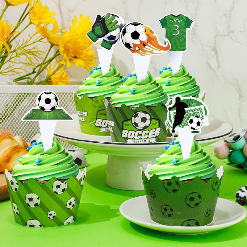 - ⚽【HIGH QUALITY MATERIAL】 This soccer theme cupcake toppers and wrappers are made from premium quality cardstock material, sparkling as cupcake or dessert decoration. And adopt well double-sided printed, suitable for you to decorate your delicious cake.