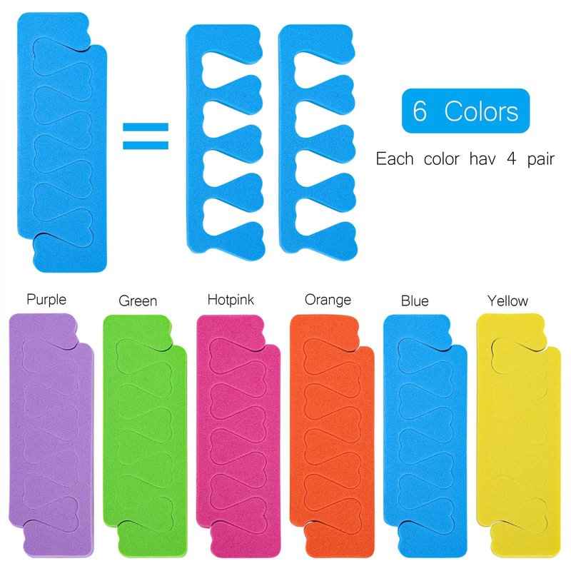 Tips: 48pcs = 24 pairs toe separators, 6 colors, blue, orange, green, hotpink, purple,yellow, each colors have 4 pairs