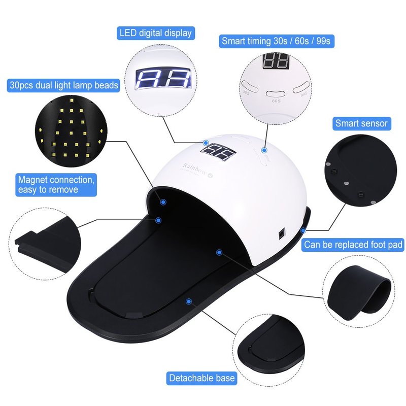 This UVLED Nail Lamp with space efficient design and 30pcs strategically placed LED, make nail drying quick and good. UVLED, no need to worry about burning your hands. Three timer setting, enabling you choose different time according to the types of nail gels so as to improve the quality of your nail arts. Flexible combination and replaceable foot pad for both manicure and pedicure. This product is exactly what you need for salon use and home DIY.