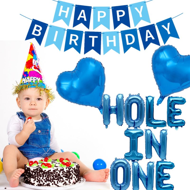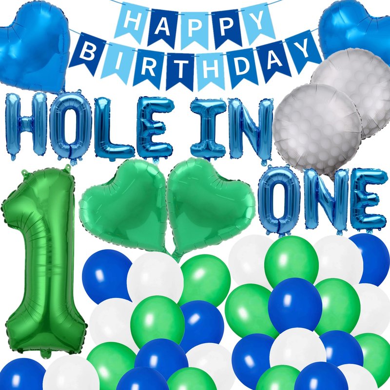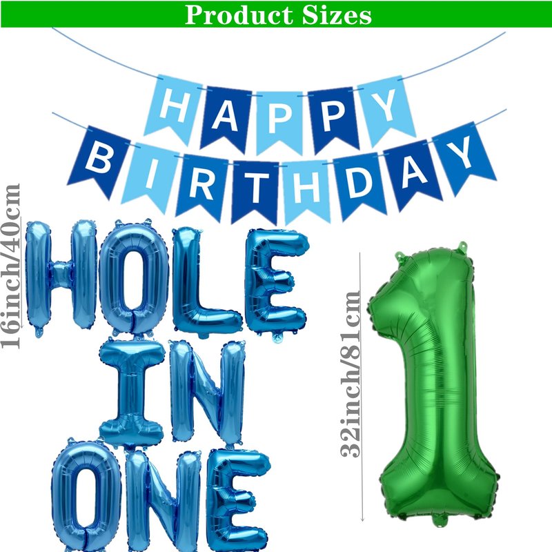 - Golf First Birthday Decoration: 16inch blue letter balloons banner "Hole In One", 1 pc blue "Happy Birthday" banner, 4pcs 18inch star balloons, 2pc 18inch golf balloons, 1pc 32inch number balloon "1", 30 pcs 10inch latex balloons, make your golf themed party very special.