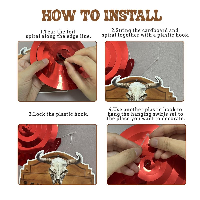- Easy Assembly: The wild west banner comes pre-drilled and simply needs to be strung together. For the wild west hanging swirl: All you have to do is link the cardboard and streamers together with the clear plastic hooks included in the package.