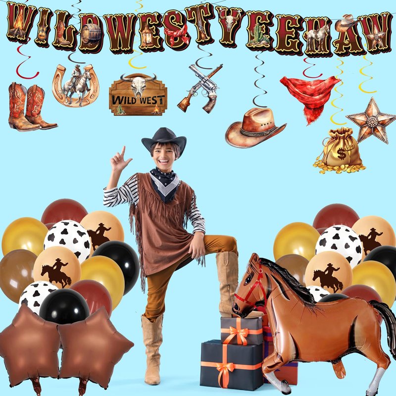 - The set of wild west cowboy party decorations including 1 WILD WEST banner, 1 YEE HAW banner,8 packs of rodeo hanging swirls featuring various wild west cowboy patterns,24pcs 12inches balloons,2pcs star foil balloons,1pcs horse shaped aluminum foil balloons.