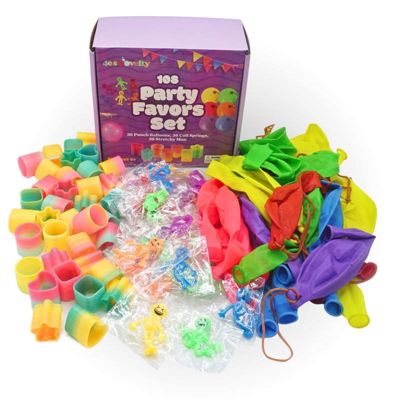 GREAT FOR - Birthday party favors for kids boys & girls all ages, Classroom reward prizes & incentives, treasure chest box toys for classroom, quiet stress toys for school, carnival prizes, end of year student gifts, sensory fidget toys party favors for kids ages 3-12, bulk goodie bag fillers GREAT FOR - Birthday party favors for kids ages 4-8 quiet stress toys for school, bulk pack of carnival prizes, end of year student gifts from teachers, sensory fidget toys party favors for kids ages 3-12, bulk goodie bag fillers COIL SPRINGS - Includs 36 mini 1.5" plastic rainbow magic springs toys in shapes of hearts, squares, circles, & stars. A fun fidget stress relief toys for Classroom reward prizes & incentives, treasure chest box toys for school. GIFT BOX - Toys come in a colorful box which makes it suitable for Birthday party favors, Christmas Halloween prizes, Classroom reward prizes & incentives, treasure chest box toys for school, bulk pack of carnival prizes, end of year student gifts from teachers, sensory fidget toys party favors for kids ages 3-12, bulk goodie bag fillers for toddlers, teens, & adults GIFT BOX - Toys come in a colorful box which makes it suitable for Birthday party favors, Classroom reward prizes & incentives, treasure chest box toys for school, bulk pack of carnival prizes, end of year student gifts from teachers, sensory fidget toys party favors for kids ages 3-12, bulk goodie bag fillers PUNCHING BALLOONS - Includes 36 18-inch color punch balloons with rubber band handles. Comes in 6 colors. Bulk punch Balloons balls Heavy duty party favors For Kids, Makes a fun game at birthdays, Christmas treat bags, Halloween giveaway, grab bags, pinata fillers,classroom rewards, birthday gifts and so on.