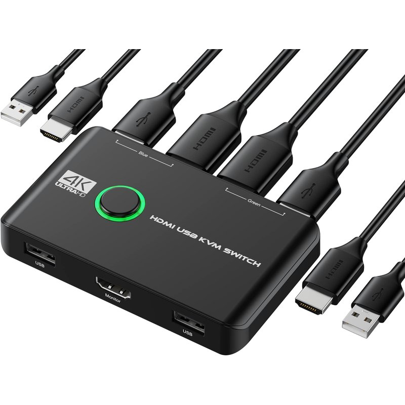 - 【USB KVM HDMI Switch】This HDMI KVM Switch allows you to control 2 computers with only one set of controls (Monitor, Mouse, Keyboard). You can easily switch between two displays. Makes your work and life much more simple and efficient. LED light color(Green or Blue) indicating the active computer.