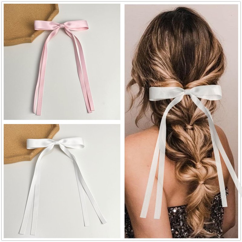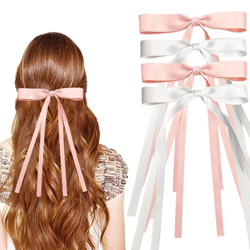4Pack Satin Hair Bow Clips with Long Tail, Bowknot Ribbon Tassel Hair Clip, Bridal Hair Accessories Gift for Women Girls