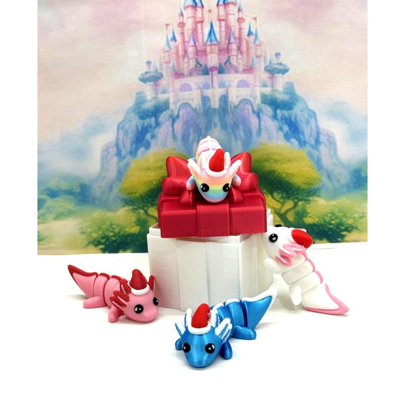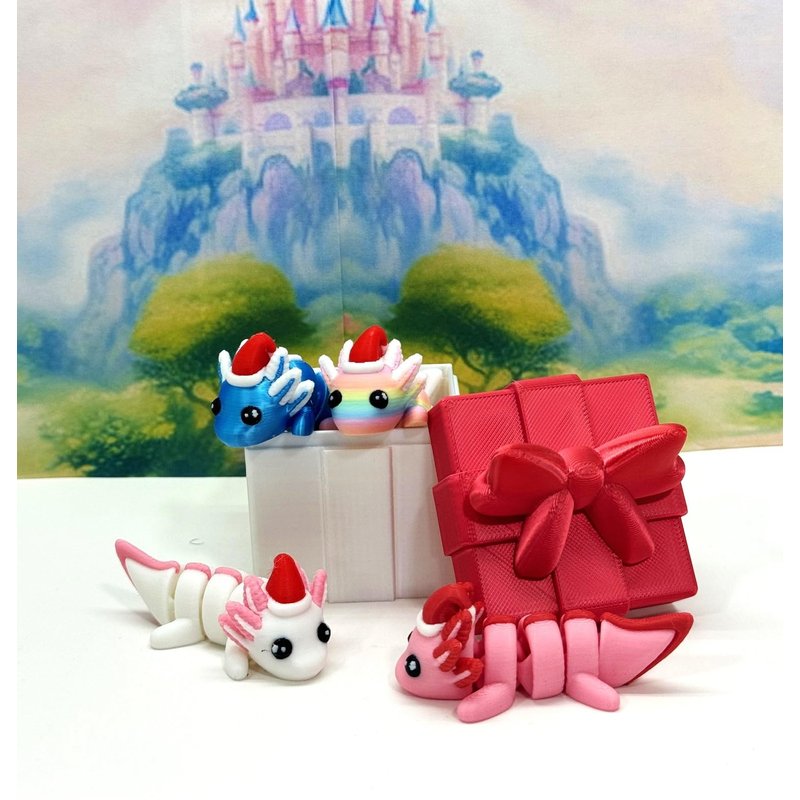 Introducing our 3D Printed ARTICULATED Mini Christmas Axolotls with 3D Printed Christmas Gift Box Container. These 4 pcs posable minis are Nice Festive Decoration, the tiny figures emerge as a heartwarming Christmas decoration, adding a touch of fun to the festive season, Their vibrant appearance and detailed design can transform Christmas tree decorations, tabletops, and layout designs, providing an unexpected change to traditional Christmas aesthetics These posable minis are meticulously crafted with an eye for detail, this interactive desk accessory is not just a source of entertainment; it's also a stress-relieving toy and a chic decor piece for any space. ------- Small Components Advisory: ------- Please be mindful that this product may contain small components and may not be suitable for very young children. Due to the nature of 3D printing, there is a potential for small components to detach if handled aggressively or dropped. As such, we advise against allowing younger children to engage with the AXOLOTL. Please be aware that 3D printed objects may exhibit minor imperfections like layer lines, inherent to the printing process. While we strive for the highest quality, these imperfections contribute to the distinctive character of each piece, making each Axolotl uniquely crafted for you. The available color options are illustrated in the provided photos. Keep in mind that variations in color may arise from discrepancies in filament production and the characteristics of your monitor or screen. Additionally, the use of multi-colored filament rolls can influence color distribution in the prints. ------- Licensing Information: ------- Authorized Design: We hold the official authorization for the production of this exquisite design created by Zou3D designs.