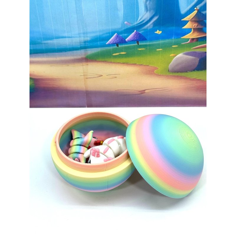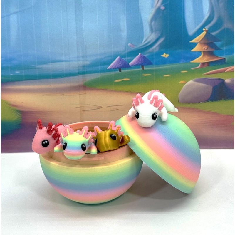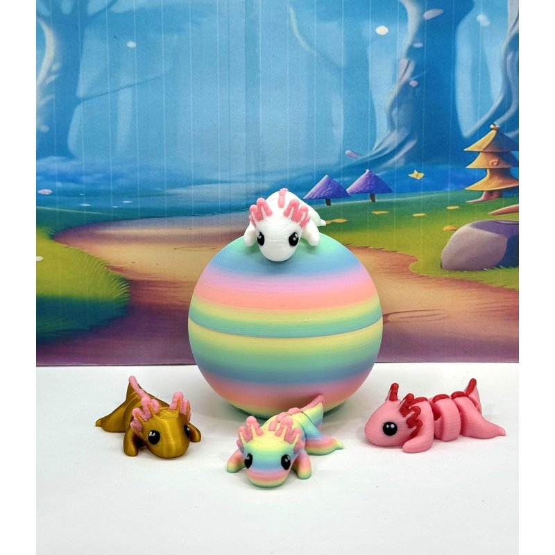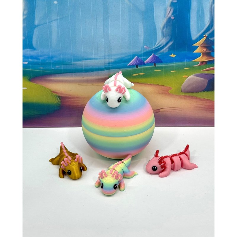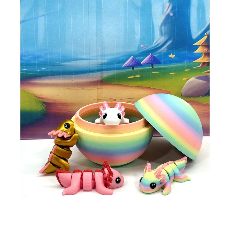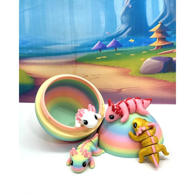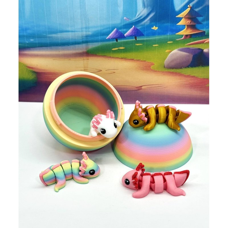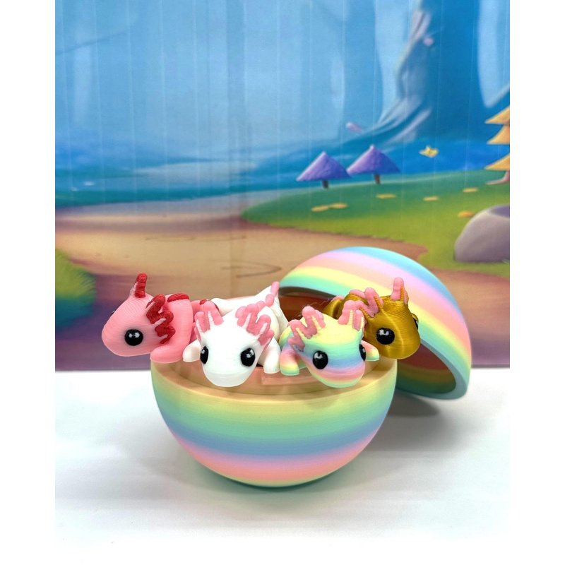 Introducing our 3D Printed ARTICULATED Mini Axolotl Tadpole with Rainbow macaroon Egg. Each mini Axolotl measures 1.75" long, very cute and articulated. These 4 pcs posable mini Axolotl are meticulously crafted with an eye for detail, this interactive desk accessory is not just a source of entertainment; it's also a stress-relieving toy and a chic decor piece for any space. ------- Small Components Advisory: ------- Please be mindful that this product may contain small components and may not be suitable for very young children. Due to the nature of 3D printing, there is a potential for small components to detach if handled aggressively or dropped. As such, we advise against allowing younger children to engage with the AXOLOTL. Please be aware that 3D printed objects may exhibit minor imperfections like layer lines, inherent to the printing process. While we strive for the highest quality, these imperfections contribute to the distinctive character of each piece, making each Axolotl uniquely crafted for you. The available color options are illustrated in the provided photos. Keep in mind that variations in color may arise from discrepancies in filament production and the characteristics of your monitor or screen. Additionally, the use of multi-colored filament rolls can influence color distribution in the prints. ------- Licensing Information: ------- Authorized Design: NOHo3D holds the official authorization for the production of this exquisite design created by Zou3D designs.