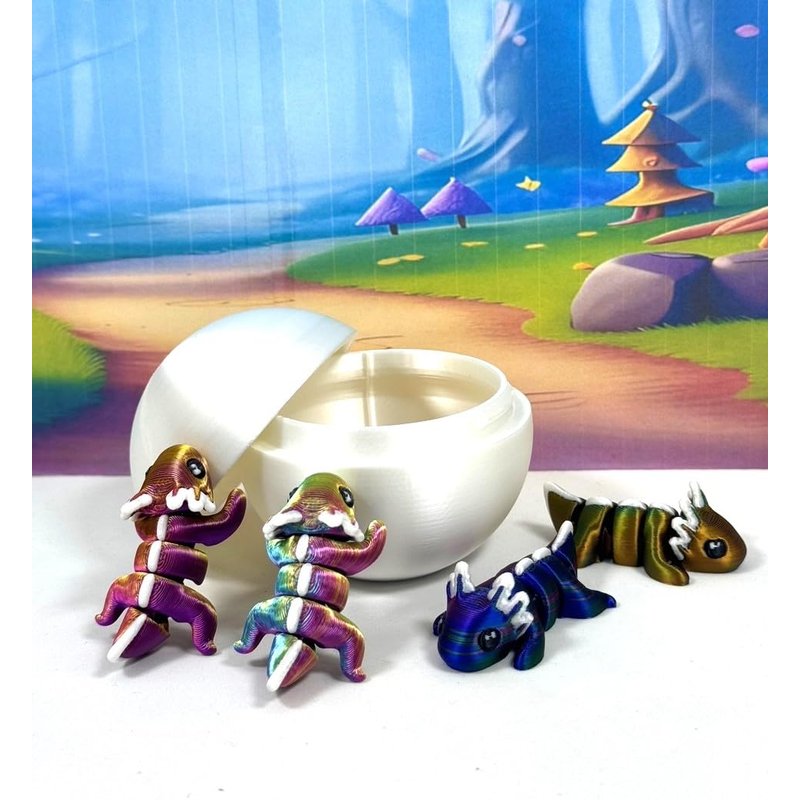Introducing our 3D Printed ARTICULATED Mini Axolotl with Egg. Each mini Axolotl measures 1.75" long, very cute and articulated. These 4 pcs posable mini Axolotl are meticulously crafted with an eye for detail, this interactive desk accessory is not just a source of entertainment, it's also a stress-relieving toy and a chic decor piece for any space. ------- Small Components Advisory: ------- Please be mindful that this product may contain small components and may not be suitable for very young children. Due to the nature of 3D printing, there is a potential for small components to detach if handled aggressively or dropped. As such, we advise against allowing younger children to engage with the AXOLOTL. Please be aware that 3D printed objects may exhibit minor imperfections like layer lines, inherent to the printing process. While we strive for the highest quality, these imperfections contribute to the distinctive character of each piece, making each Axolotl uniquely crafted for you. The available color options are illustrated in the provided photos. Keep in mind that variations in color may arise from discrepancies in filament production and the characteristics of your monitor or screen. Additionally, the use of multi-colored filament rolls can influence color distribution in the prints. ------- Licensing Information: ------- Authorized Design: NOHo3D holds the official authorization for the production of this exquisite design created by Zou3D designs.