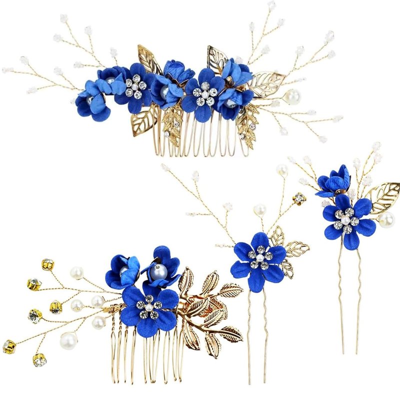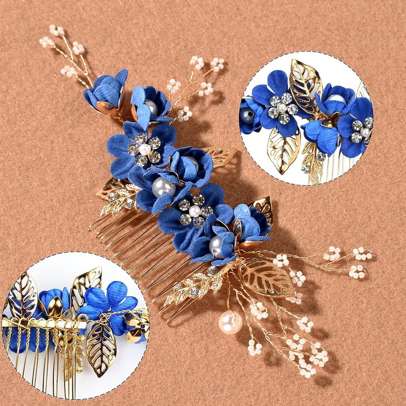 - Wedding hair combs are made of pearl, fabric flowers, golden leaves and and sparkling rhinestone, well crafted, rounded teeth will not scratch your scalp, and you can bend the pieces a little to contour to your hairstyle.