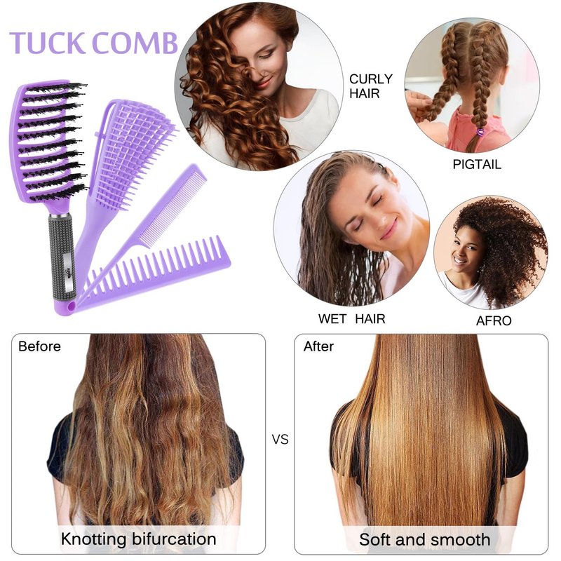 - 【4 Hair Brush Set】 1 detangler hair brush, 1 Boar Bristle Hair Brush, 1 Wide Teeth Comb Brush, 1pc parting comb. This is one of the perfect detangling brush set for your curly hair. A wide variety of styling tools to meet your different hair care needs.