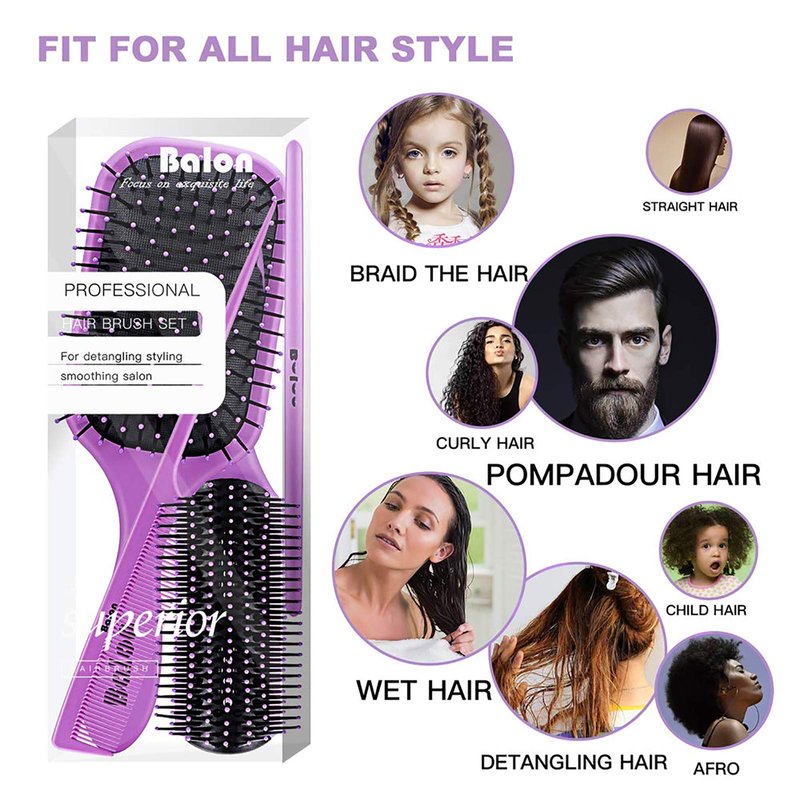 - 4 IN 1 HAIR BRUSH SET: This is a detangler brush and comb set which include 4 kinds of brushes and combs. Paddle brush, styling brush, wide tooth comb and tail comb. The best hair brush can meet your different hair care needs.