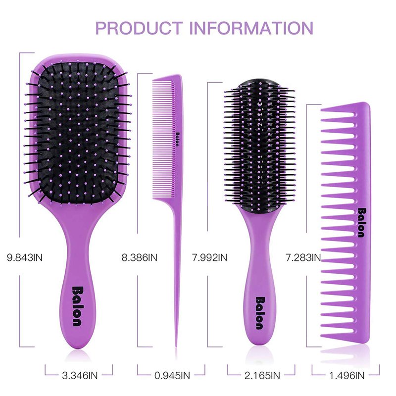 Introducing the 4-in-1 Detangling Hair Brush Set from Balon, designed to provide a comprehensive hair care solution for all hair types. This set includes a paddle brush, styling brush, wide tooth comb, and tail comb, all made with soft plastic bristles that are gentle on your scalp and effective in removing knots and tangles for both wet and dry hair. The carbon material used in the combs is anti-static, preventing hair winding and electrostatic problems. These brushes are perfect for long, short, thick, curly, and natural hair, making them an ideal gift set for women, men, and kids of all ages. The set is available in a stylish purple color, and the bristles provide a painless massaging experience that may help increase hair growth and add shine to your hair. Use these brushes for wet or dry hair to remove knots and tangles, with bristles that massage the scalp, following the directions provided for the best results.