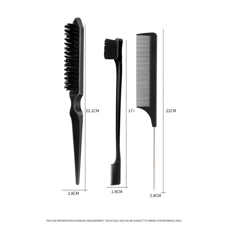 this set includes three high-quality combs: a Rat Tail Comb, Teasing Brush, and Edge Brush. Each comb is designed with precision and durability in mind, featuring the perfect distance between teeth to prevent hair breakage or scalp damage. Whether you're sectioning hair for intricate braids or teasing for voluminous updos, these combs deliver professional-grade performance.