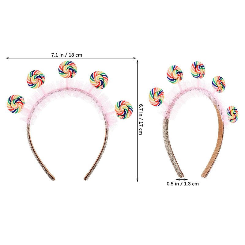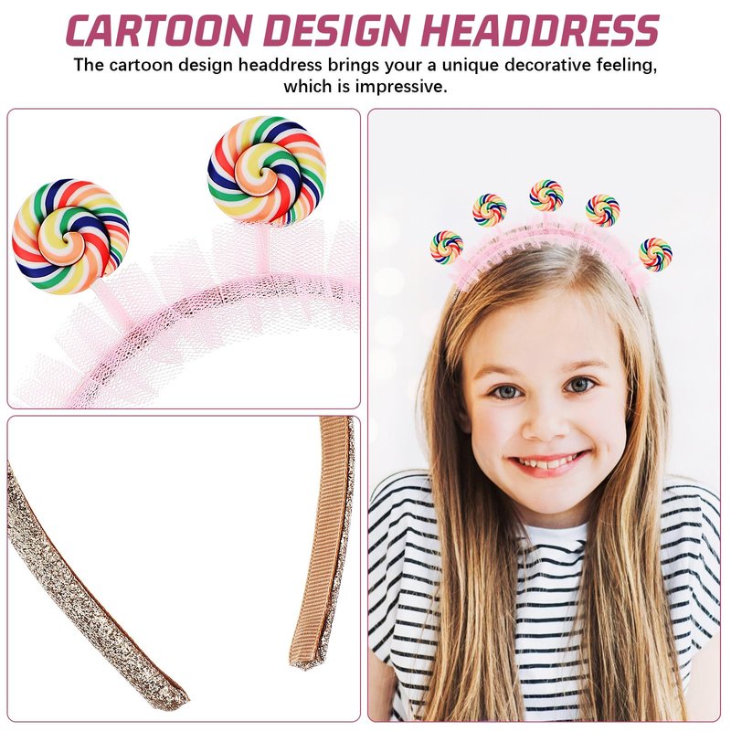 DescriptionCartoon Lollipop Headbands Pink Candy Headband Sweet Princess Headband Hair Hoops Lovely Flower Girl Headpieces Lollipop Costume Hair Decor Party Favors FeaturesColor: As Shown Material: PlasticSize:18 x 17 x 1.3cm/7.07 x 6.68 x 0.51inBirthday headband has lovely style and fashionable design, highlight your appearance, make you look more beautiful.This rainbow lollipop birthday tiara suitable for various occasions, like birthday party, christmas party, also ideal for photo props.The girls birthday headbands can be a decorative photo prop, and you can use it to take some interesting pics.Package Including4pcs Cartoon Lollipop Headbands