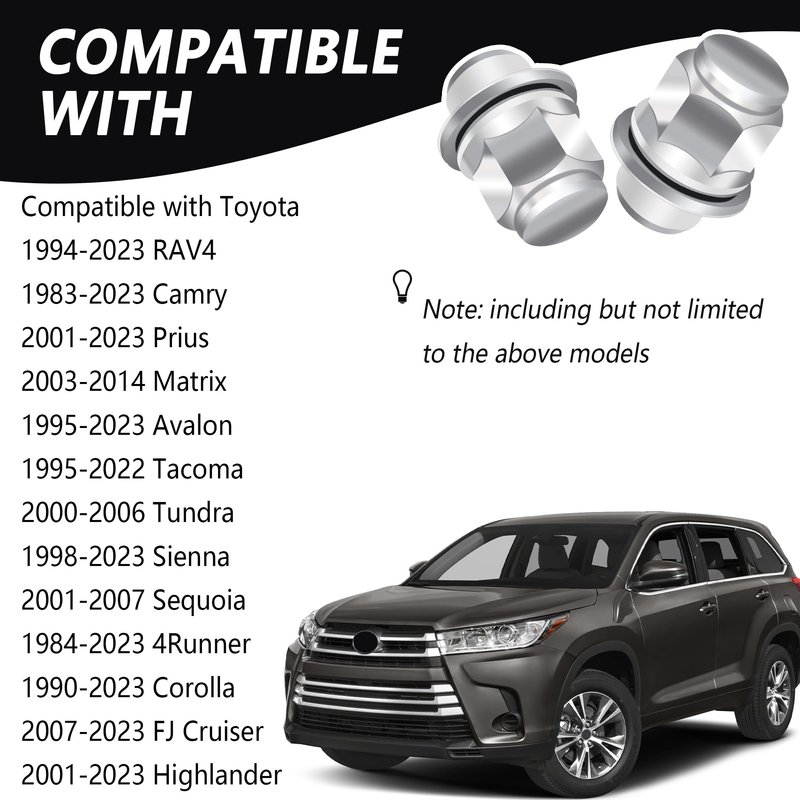 - 🔩 Lug Nuts Compatibility - Lug nut set are compatible with Toyota 1994-2023 RAV4, 1983-2023 Camry, 2001-2023 Prius / Highlander, 2003-2014 Matrix, 1995-2023 Avalon, 1995-2022 Tacoma, 2000-2006 Tundra. Before purchasing, please make sure that your model and wheel specifications match the chrome lug nuts.