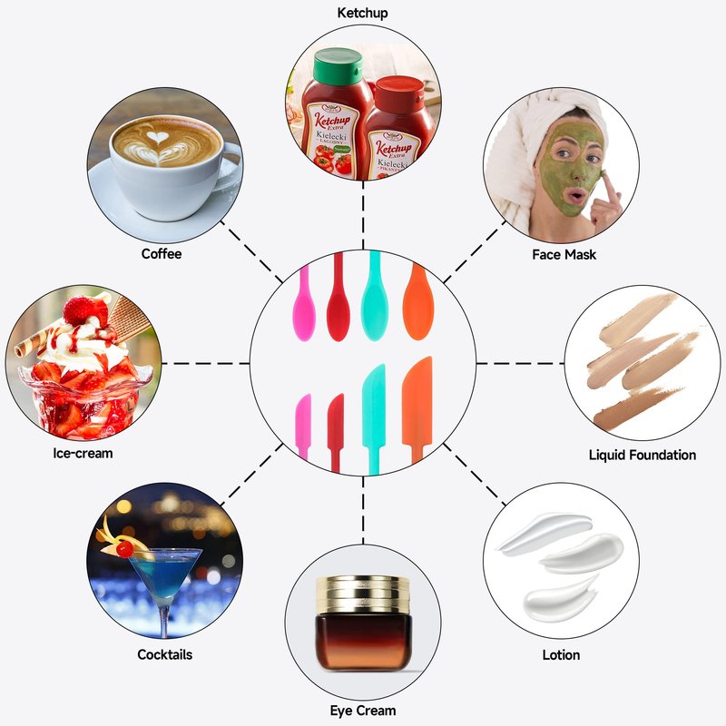 - ✅ Wide Application -- Our small silicone spatulas can also be applied for cosmetics, hand body lotion,facial mask,lip gloss,mud mask,peanut butter, ketchup and other every day items.
