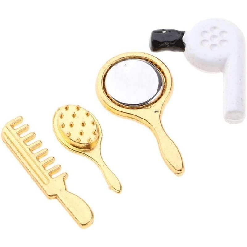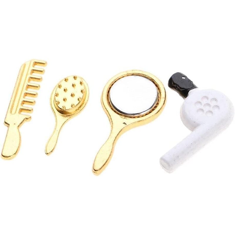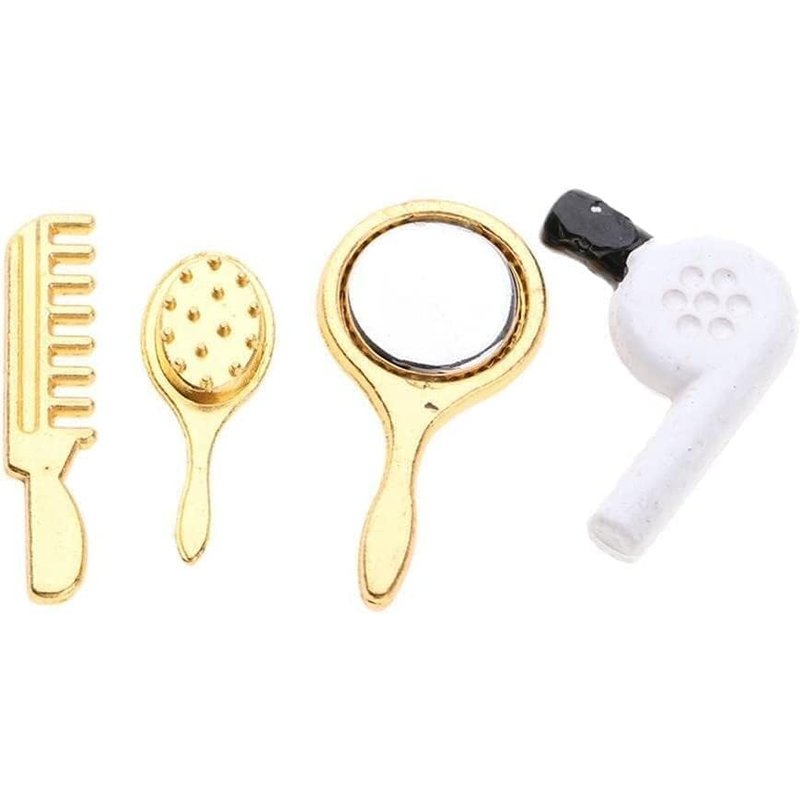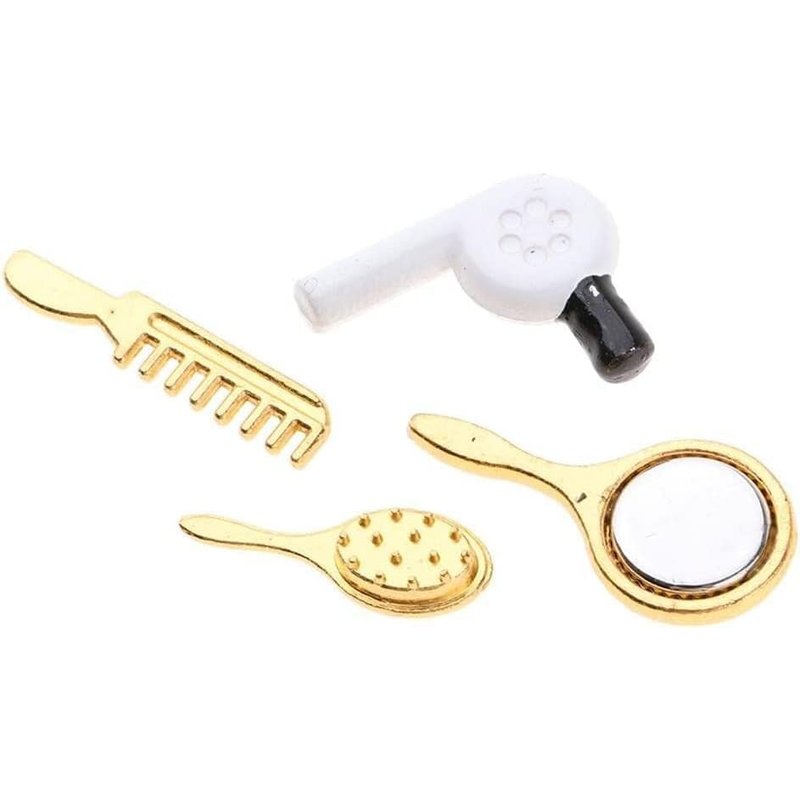 Bring a touch of whimsy to your dollhouse with this delightful 4-piece miniature set. Featuring a comb, hair dryer, mirror, and makeup set, it's the perfect accessory for adding realistic details to any doll's dressing area. Crafted with meticulous attention to detail, these tiny replicas are sure to captivate and delight. At approximately 1/12th scale, they seamlessly blend into most dollhouse scenes, allowing you to create truly immersive displays. Whether you're an avid collector or simply appreciate the art of miniatures, this set is an enchanting addition to your collection.