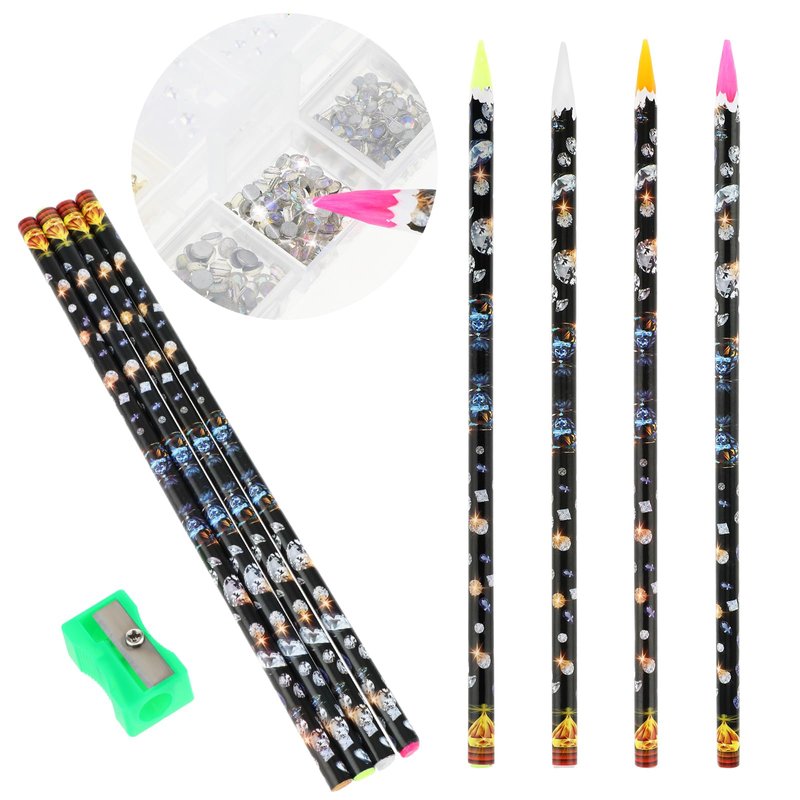 4Pcs Self Adhesive Resin Rhinestones Picker Pencil, Mabor Nail Point Diamond Drill Pen with Pencil Sharpener Gem Pick up Tools for Girls Women Nail DIY Decoration