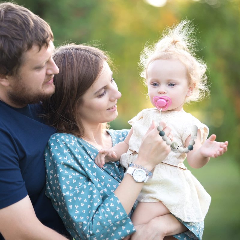 - Silicone Material: Pacifier Clip Length : About 9.6 (inch). Weight: 0.18 (pounds). Made of silicone material, free from harmful chemicals, safe and non-toxic for babies. It can be used for a long time, which saves your money and time for shopping.The silicone beaded pacifier can provide teething relief and massage, promote babies teeth strongly development.