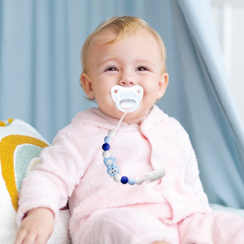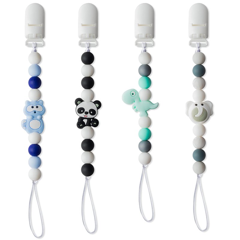 - Lovely Design:Package included 1pc black panda pacifier clip , 1pc green dinosaur pacifier clip, 1pc gray elephant pacifier clip, 1pc blue raccoon pacifier clip.Different styles of pacifier clips can meet your baby's different preferences. The rope allows you to replace the pacifier clip anytime and anywhere.