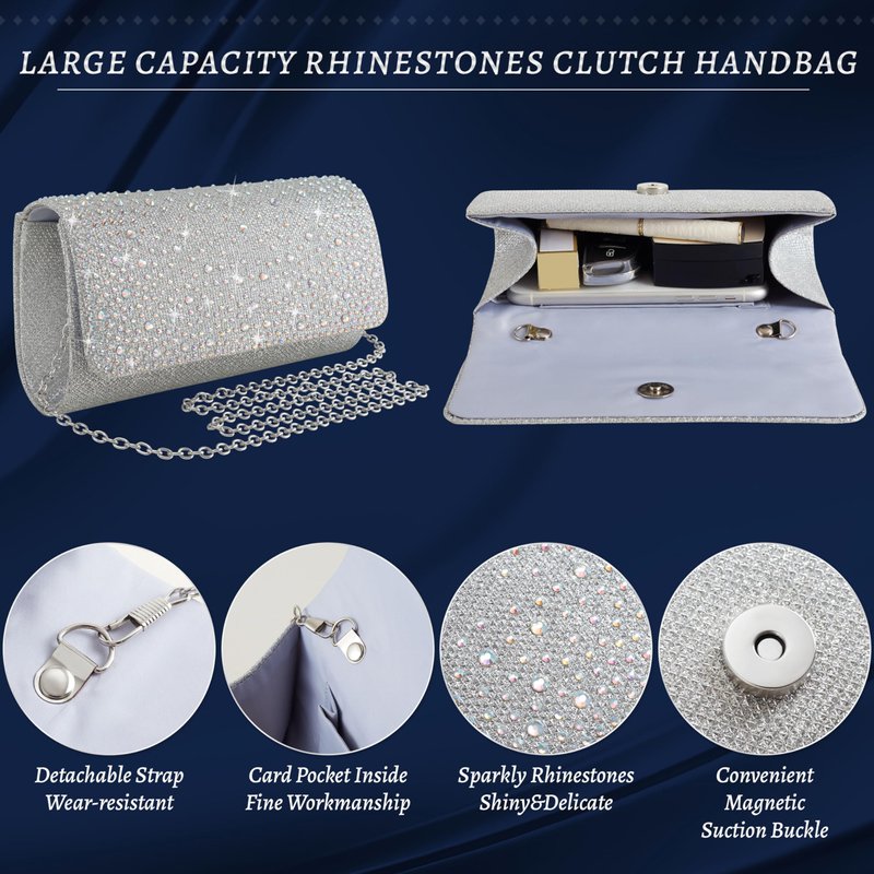 - ❀Fancy Silver Purse Clutch for Women:Real silver rhinestones clutch bag for wedding party,It is fully decorated with rhinestone crystals and sparkly glitter material,match with high-quality wear-resistant hardware parts, show you more shiny and charming in many occasions,a truly classic and versatile luxury bag.Easy to us with a magnet button closure.