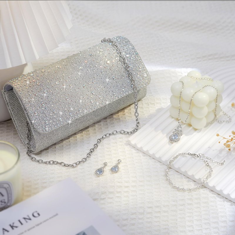 - ❀Pack:4Pcs all silver clutch purse bag jewelry set,unique item.You wiill receive 1 piece of necklace,1 piece of bracelet,1 pair of earrings,1 piece of clutch bag.
