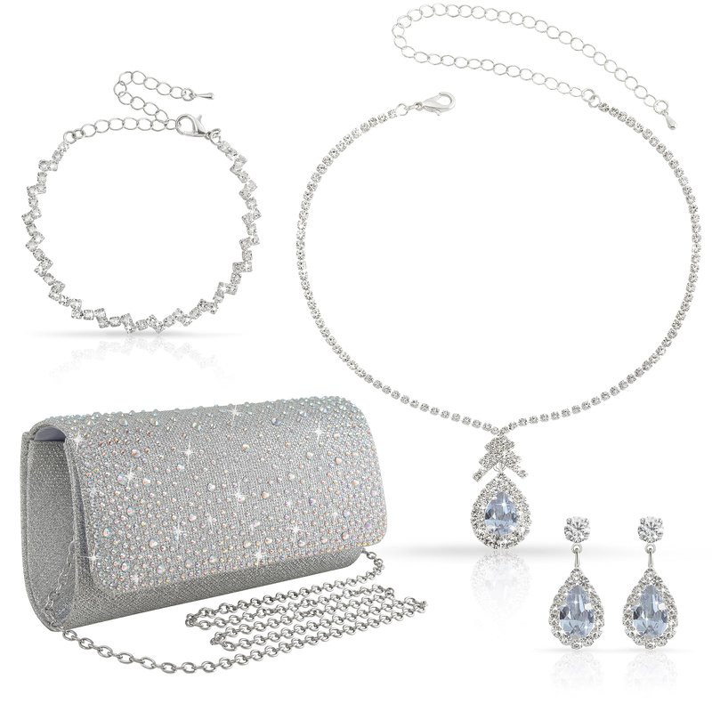4Pcs Silver Clutch Formal Purse Bag Jewelry Set for Women Evening Handbags Bling Rhinestone Necklace Earrings Bracelet Clutches Set for Women(Bling Style)