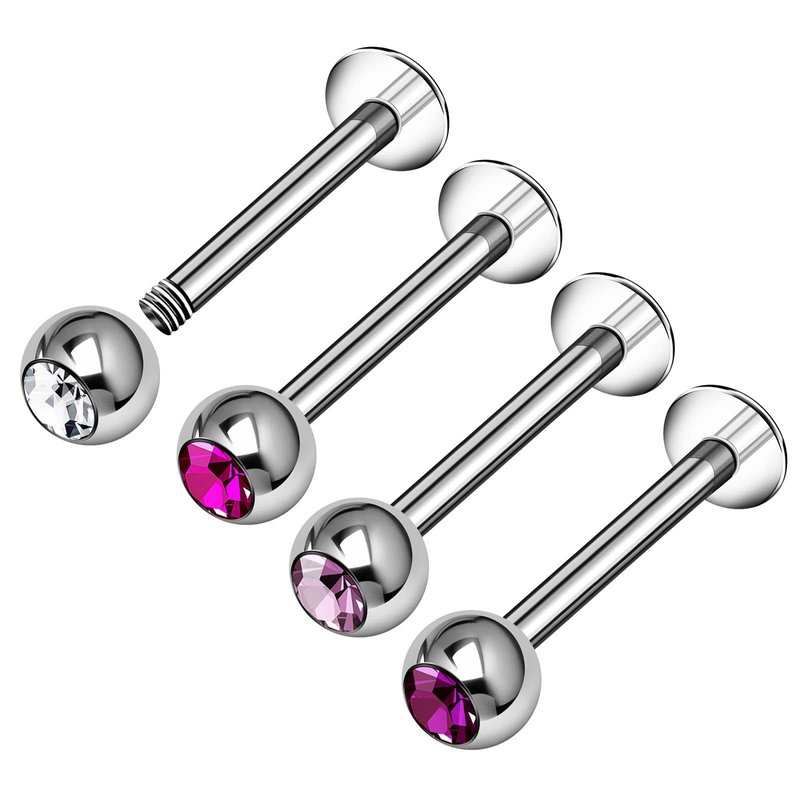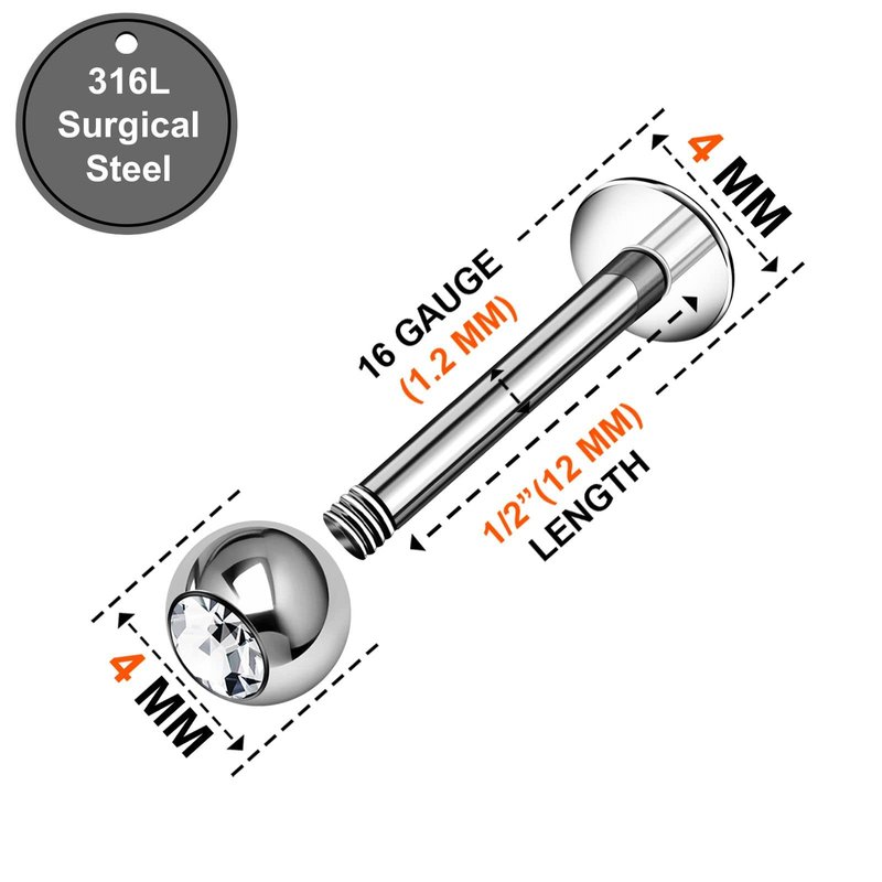 - YOU WILL GET One piece of 16g 3/64" (1.2mm) 1/2"(12mm) 316L Surgical Steel labret monroe stud 4mm Clear crystal ball end. One piece of 16g 3/64" (1.2mm) 1/2"(12mm) 316L Surgical Steel labret lip stud 4mm Fuchsia crystal ball end. One piece of 16g 3/64" (1.2mm) 1/2"(12mm) 316L Surgical Steel labret lip piercing jewelry 4mm Light Amethyst crystal ball end. One piece of 16g 3/64" (1.2mm) 1/2"(12mm) 316L Surgical Steel labret studs flat 4mm Amethyst crystal ball end.