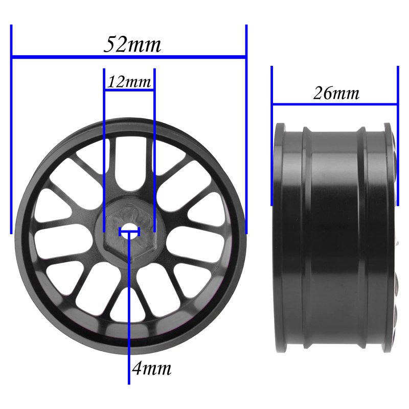 - Width: 26mm/1.02"; Outer Diameter: 52mm/2.04" ; Hex Size: 12mm;Axle Hole: 4mm,Color:Red/Blue/Black(Optional)