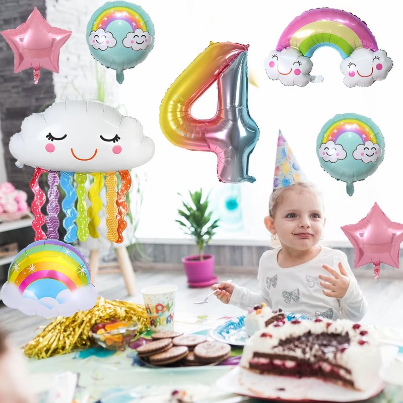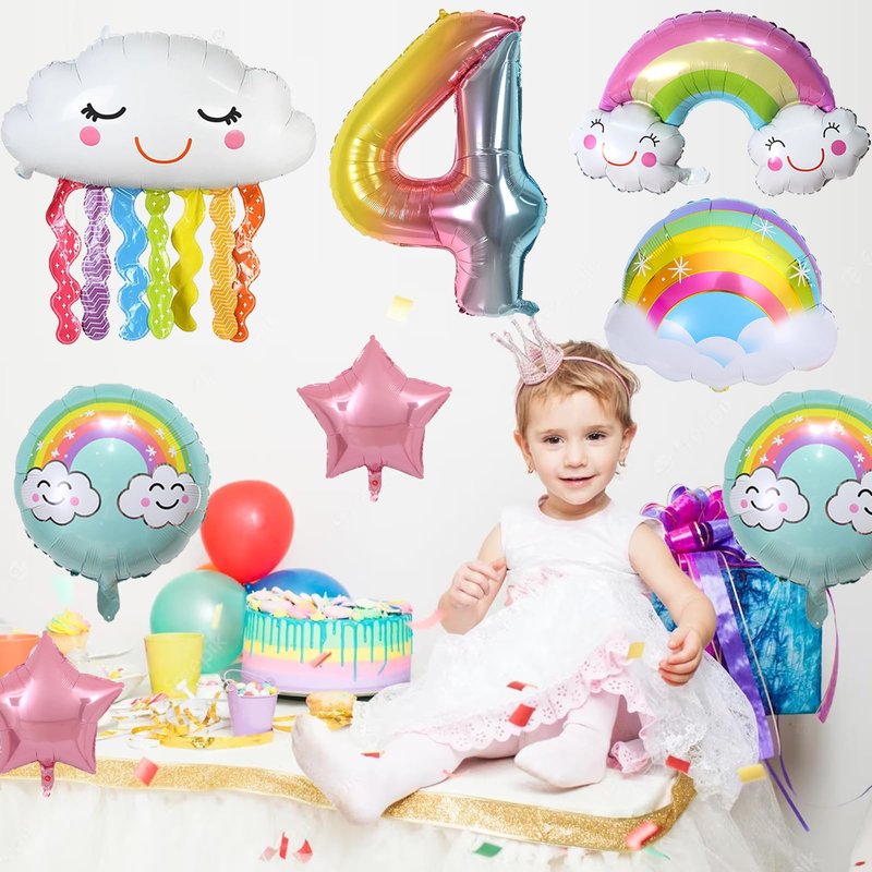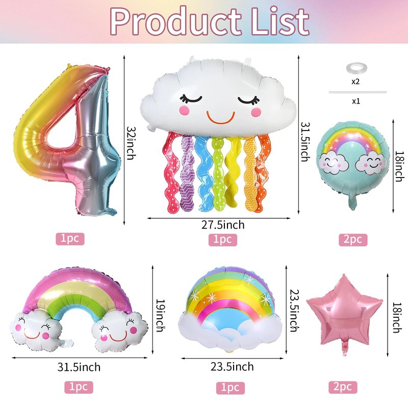 - Package included-you will receive 1x number Balloon,1xLarge Fringed Clouds, 1xLarge white cloud smiley face, 1xLarge rainbow of clouds, 2xRainbow round aluminum film, 2x Pink aluminum film stars, 2xRibbon, 4xStraw, which contain sufficient quantity to meet your decorative needs and save time and energy to mix and match the styles on your own.