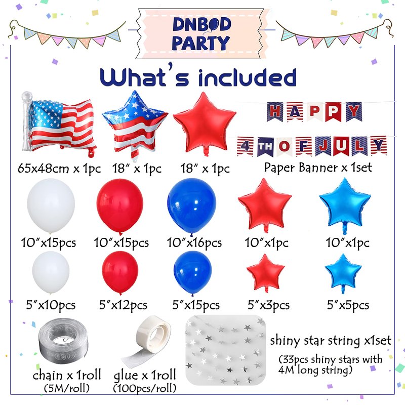 - 【Wonderful 100pcs collocation】The set contains 83 pcs latex balloons , 13pcs foil balloons ,1set 4th of July paper banner ,1set shiny star sting banner ,balloon glue and balloon chain. Navy Blue latex balloons match red and white balloons , to create classic party atmosphere. Red and blue Star balloons make it more cute .Don't forget wonderful USA flag balloon .Then dressup shiny star string inside the arch . Finally hang the 4th of July paper banner ,get a wonderful 4th of July balloon arch .