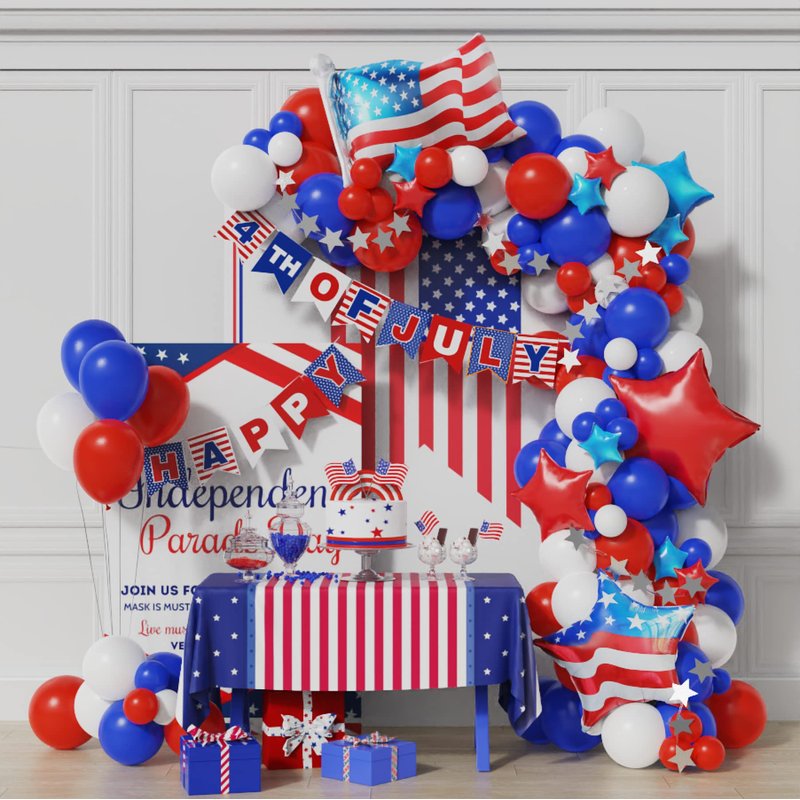 The balloon set contains 83 pcs latex balloons , 13 pcs foil balloons ,1 set 4th of July paper banner ,1set of shiny star sting banner ,1 roll of balloon chain and 1 roll of balloon glue point .contains the popular navy Blue color latex balloons , match the red and white color , to create the classic party atmosphere. red and blue Star shaped foil balloons make the balloon arch more cute ,and don't forget the wonderful main character for the USA flag pattern foil balloons .then we could dress the shiny star string banner inside the balloon arch .Finally let's decorate the 4th of July paper banner on the balloon arch . You will get a popular ,wonderful ,cute 4th of July party balloon arch .