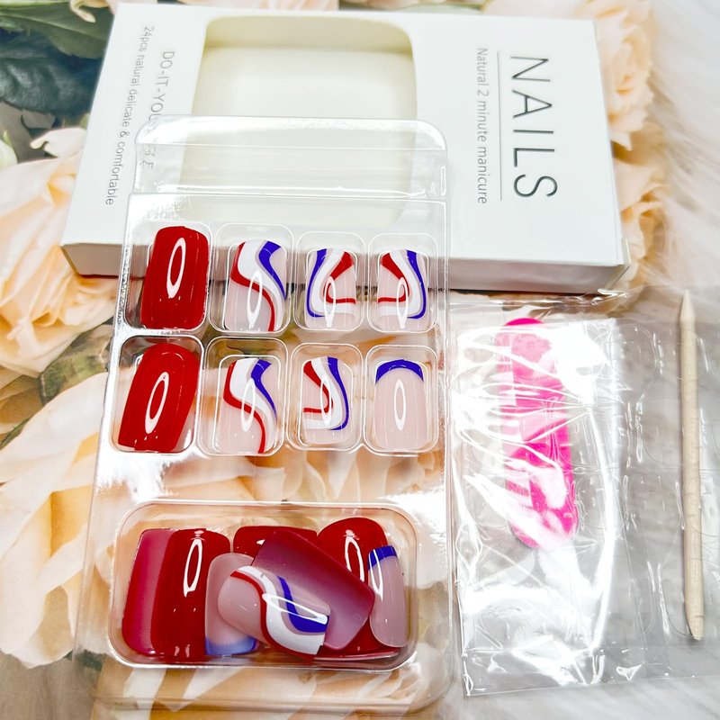 1.Red blue white line press on nails are easy to use, it only takes a few minutes to complete a manicure.