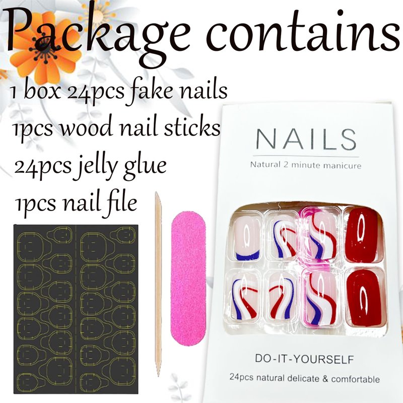 - Package Includes: 24 PCS Independence Day press on nails in 12 different sizes, +1 nail file + 24pcs jelly glue stickers+1 wooden stick. You can choose the size that best suits your own nails for a secure and comfortable fit.