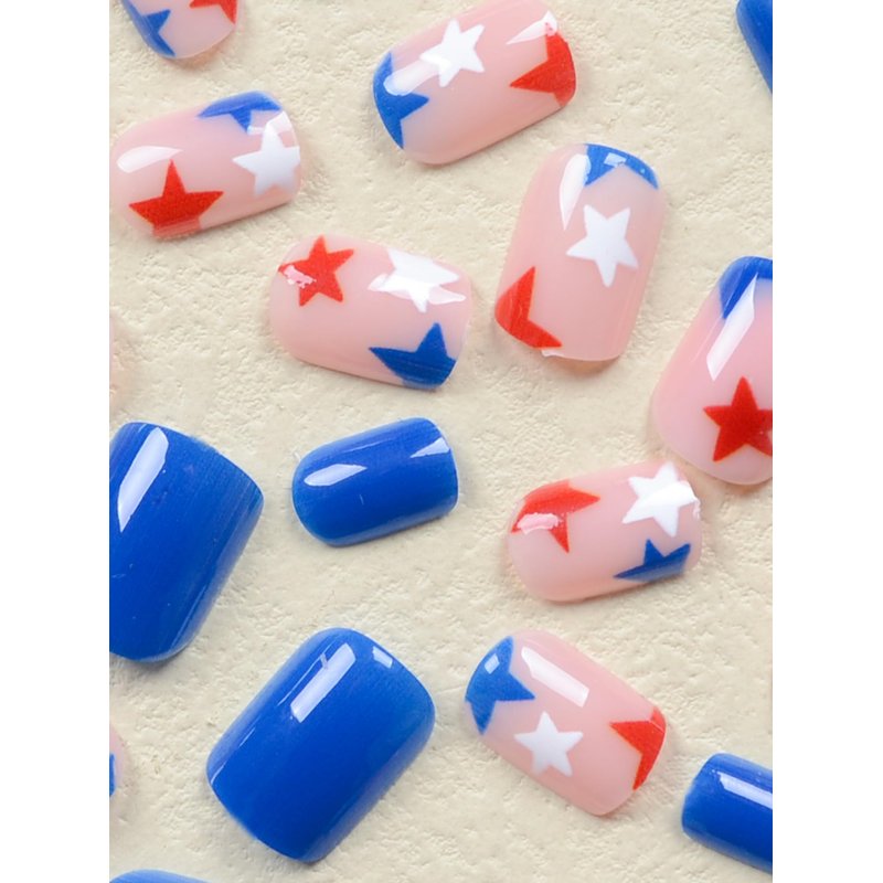 4th of July press on nails extra short square false nails with star designs.They made of high-quality glossy acrylic,it provides a durable and long-lasting choice for women daily nail decoration.These easy to apply nails can enhance your usual look,aiming to effortlessly and elegantly enhance your style.