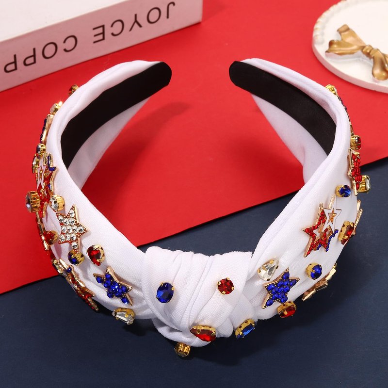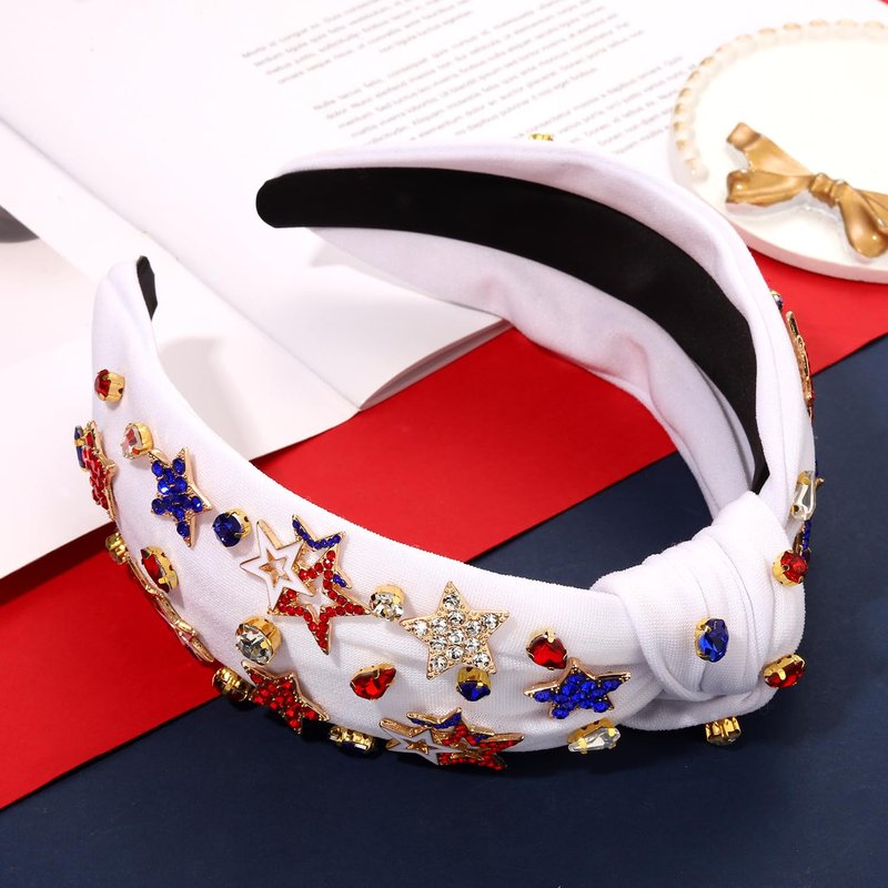 - ♥Rhinestone Knotted Headband -- Get ready for the Fourth of July with this jeweled top knot headband. Pair them with your favorite tees, tank tops, shorts, cut-offs, jeans and sundresses for a cute and festive patriotic outfits. Your patriotism is on full display with this red, white and blue American flag hairband. These will look great as we celebrate our great Memorial Day, Flag Day, or Fourth of July!