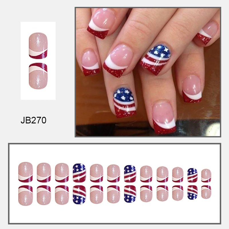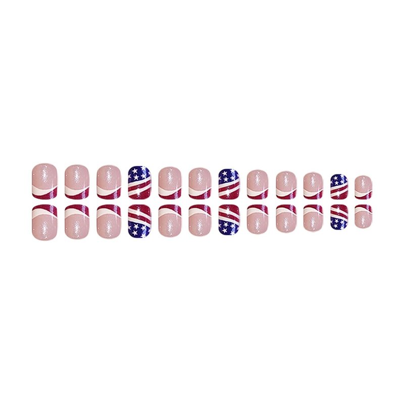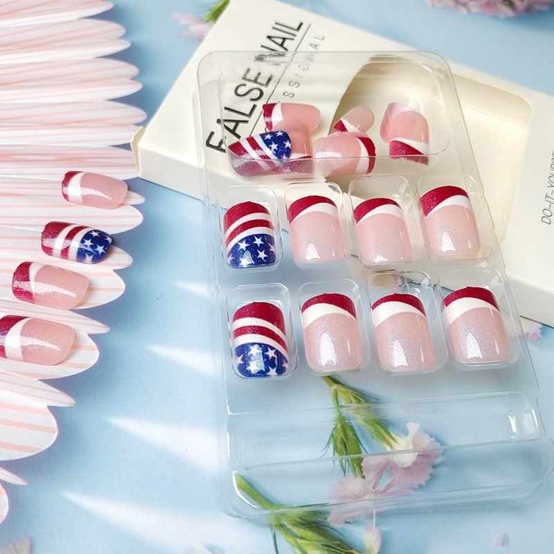- 【Package】24Pcs 4th of July false nails, 24 pieces of jelly glue, 1 mini nail file, 1 wooden stick. ( jelly glue is not as strong as liquid glue, but it can make false nails reusable. Please use appropriate glue according to different occasions).