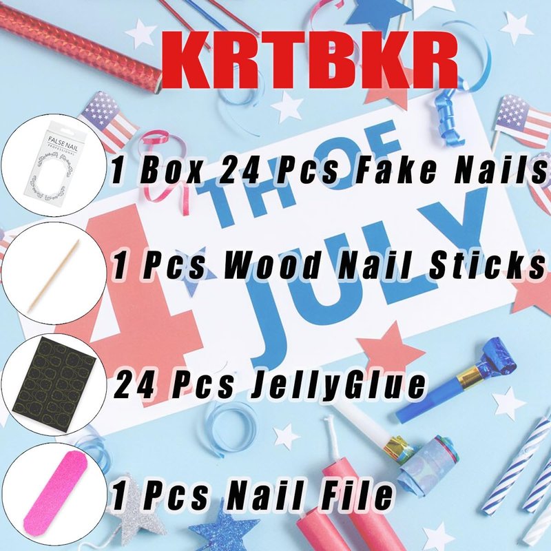 - Package Contains: Our 4th of July press on nails designs glitter false nails is exquisite and beautiful. It contains 24 pcs short square fake nails and a set of DIY nail art tools. There are 12 different sizes of independence day fake nails. You can choose the most suitable medium long fake nails for yourself.