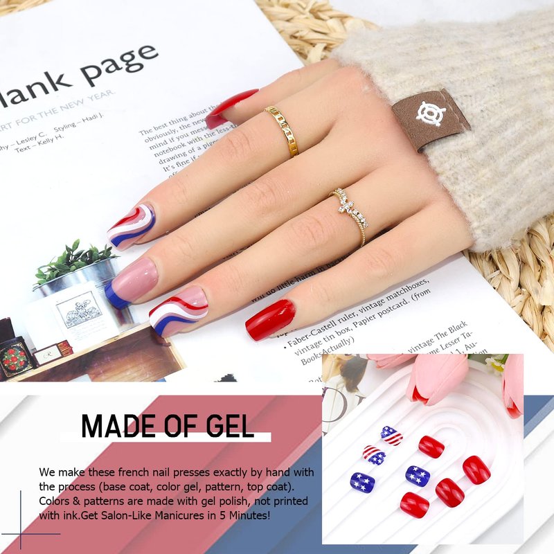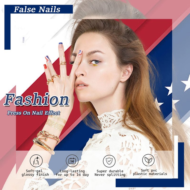 - [USA flag design] This Independence Day fake nail is designed with red white blue french line, which makes your nails look more elegant, expresses your gratitude and love for 4th of July, and enables you to have patriotic style nails.
