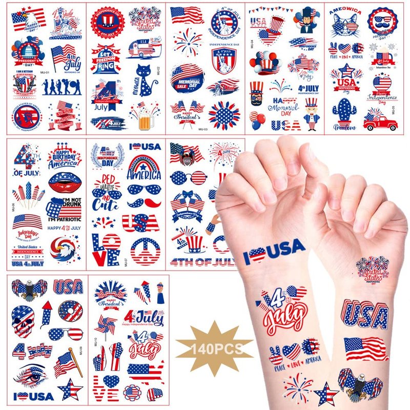 4th of July Tattoos Decorations 140Pcs USA Patriotic Temporary Tattoos for Kids Women American Flag Eagle Firework Shape Waterproof Face Body Fake Tattoos Sticker for Independence Day Party Supplies