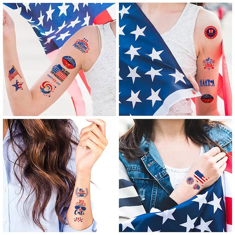 - 【Easy to Use】 Place Independence day temporary tattoo face down on your skin, soak the tattoo, wait 20-30 seconds, gently peel off the paper, and then make the tattoo dry. You can stick it anywhere on the skin you want. Tattoo sticker can stay for 2-3 days, but if you want to remove it, you can rub it with baby oil.
