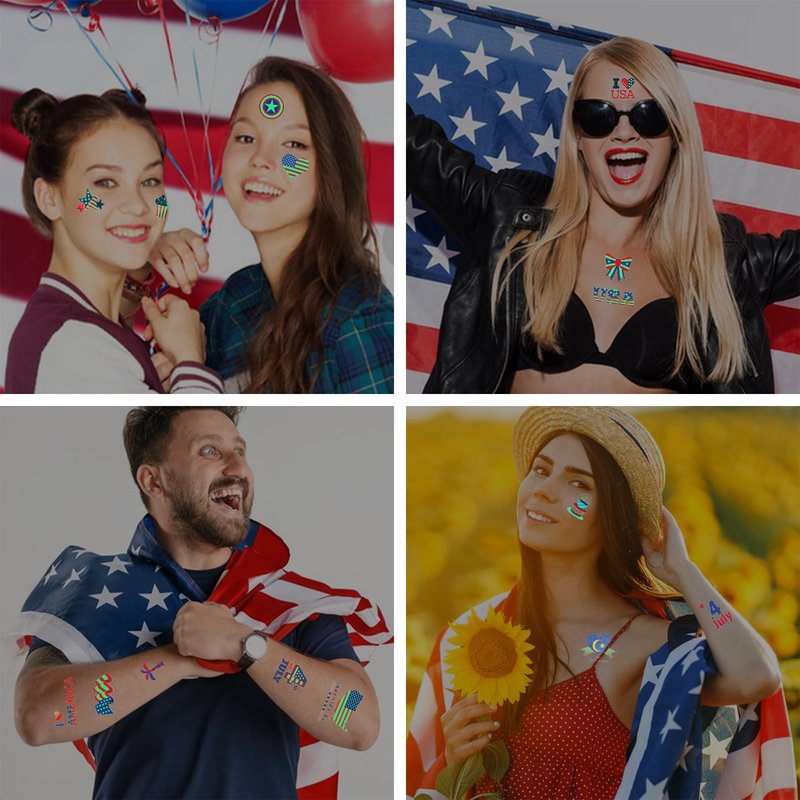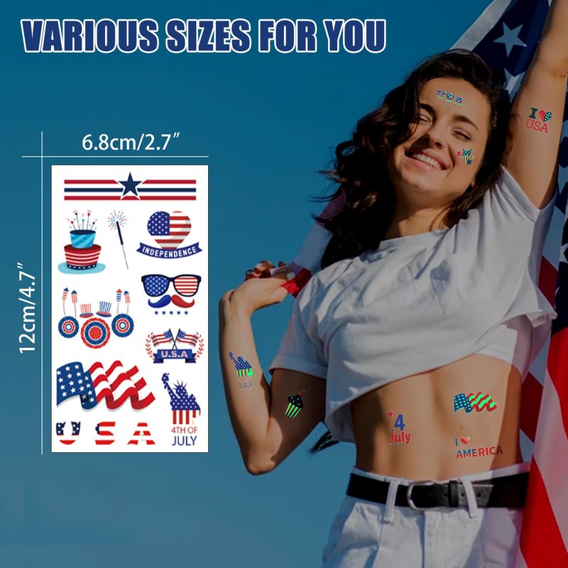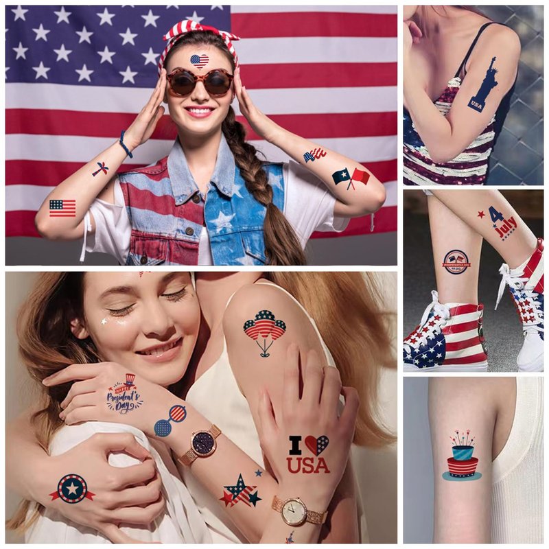 - ❤【Classic Patriot Style】show off your patriotic side with these July 4th temporary tattoos, they are featuring American flags, fireworks, eagles, hats, I love USA, hearts, football, sunglasses, stars and more;