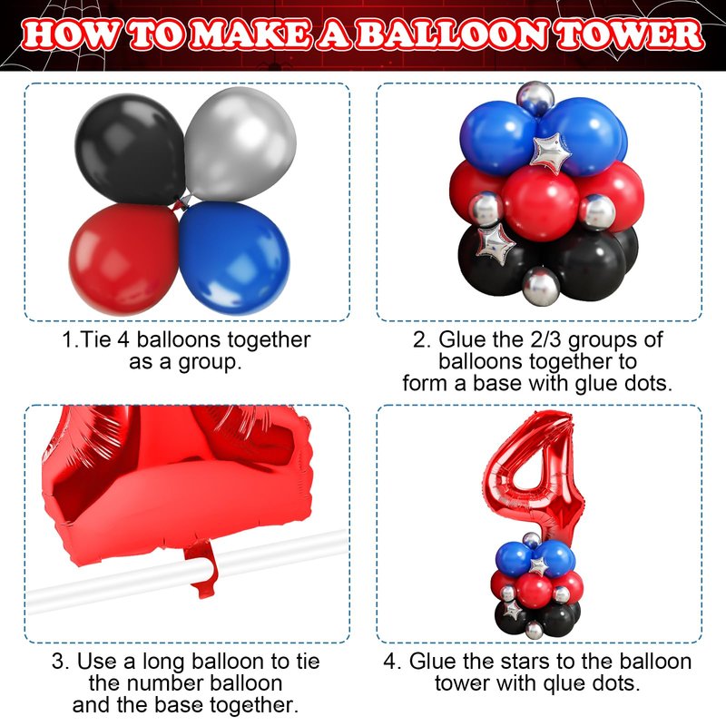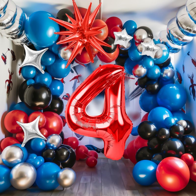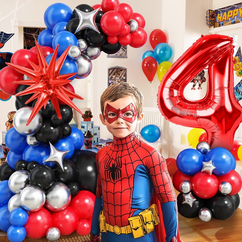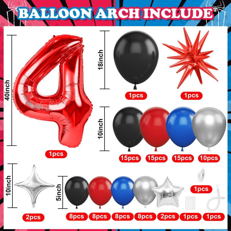 - Spider 4th Birthday Party Supplies Set: Spider birthday decorations kit including: 1Pcs 40inch red number balloons, 5pc star foil balloons (Five-pointed 2pcs, Four-pointed 2pcs, Explosion Star 1pc), Black balloons (18'' 1pcs+10'' 15pcs+5'' 8pcs), Royal blue balloons (10'' 15pcs+5'' 8pcs), Red balloons (10'' 15pcs+5'' 8pcs), Metallic Silver balloons (10'' 10pcs+5'' 8pcs), stripe tape and sticky dots. Enough for your kid’s spider hero birthday party.