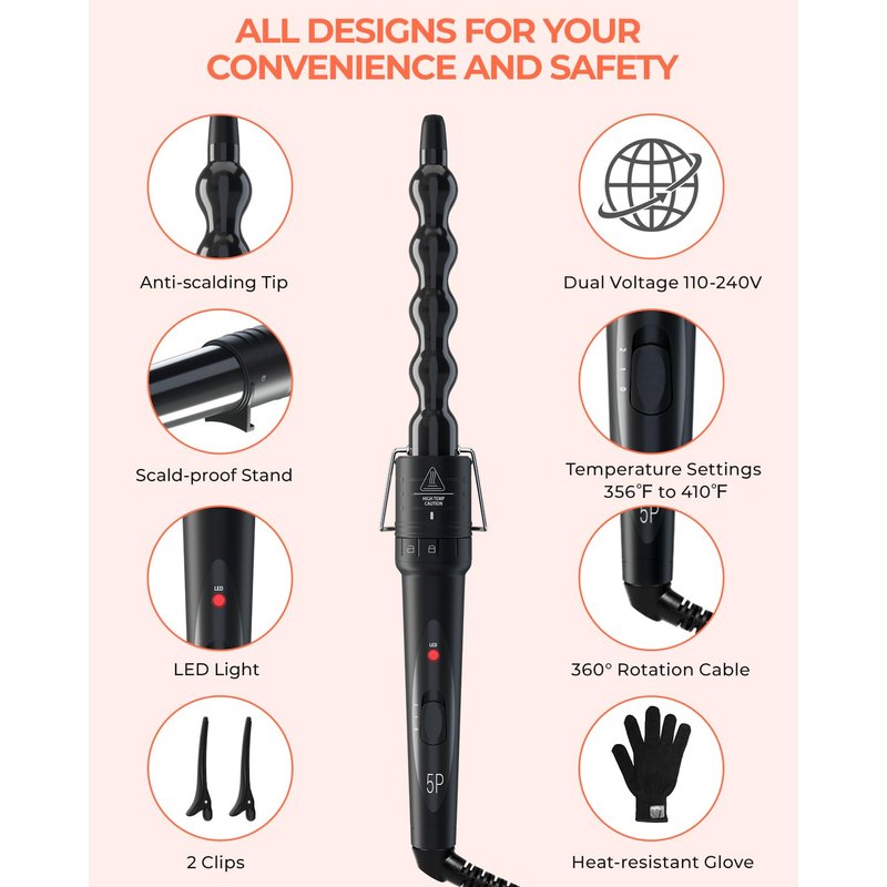 - 5-in-1 Curling Wand Set: Get the gorgeous hair you've always wanted without running to the salon every week! You can do almost anything with the 5 different sized barrels (0.35-0.7inch, 0.7-1inch, 1inch, 1-1.25inch and 1.25inch). Plus, universal 110v-240v dual voltage, 2 clips, heat-resistant glove and the 360° swivel cord make it travel-friendly, safe and convenient to use.
