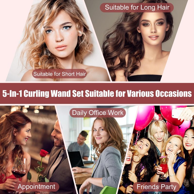 - 🌟Multiple Hairstyle Options - This 5 in 1 curling iron set includes 1/2 inch small curling iron, 1/2 - 1 inch tapered hair wand, 1 inch and 1 1/4 inch large barrel curling iron, 1 1/2 inch curling iron brush , these curling wands with different sizes can style your hair effortlessly and achieve beautiful hairstyles with ease