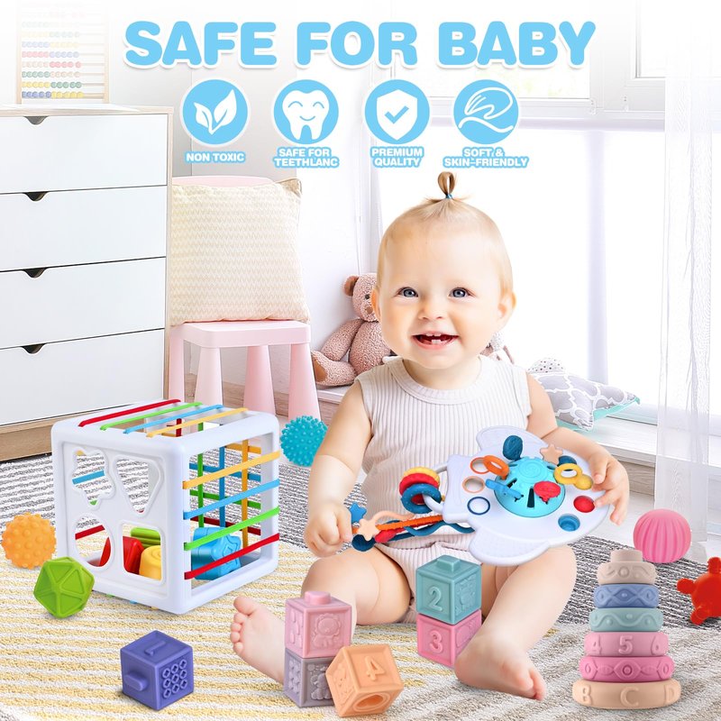 - Thoughtfully Curated Components: Our meticulously designed set showcases an engaging array, featuring Sensory Shapes & Colorful Storage Bin complete with 4 shape blocks, a pull string toy, 6 stacking blocks, 6 stacking rings, and 5 sensory balls. Each element is expertly crafted to nurture fine motor skills and heighten spatial awareness.