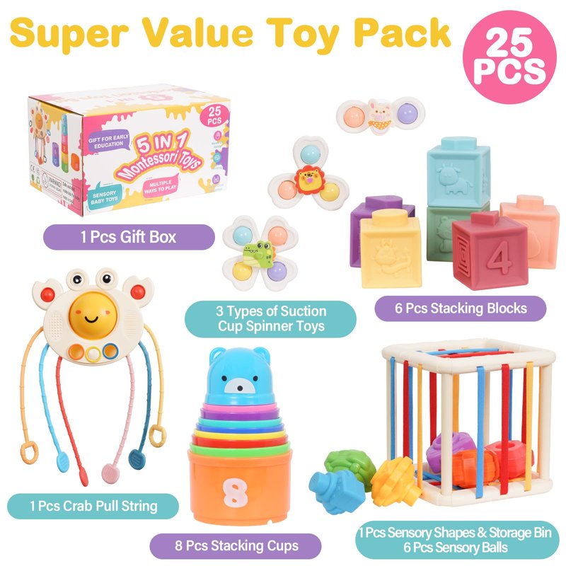 - 5 in 1 Montessori Toys Set: This baby toys set contains Stacking Blocks, Pull String Teether, Sensory Shapes & Storage Bin, Stacking Cups and Suction Cup Spinner Toys.Great educational baby toys 6-12 12-18 months