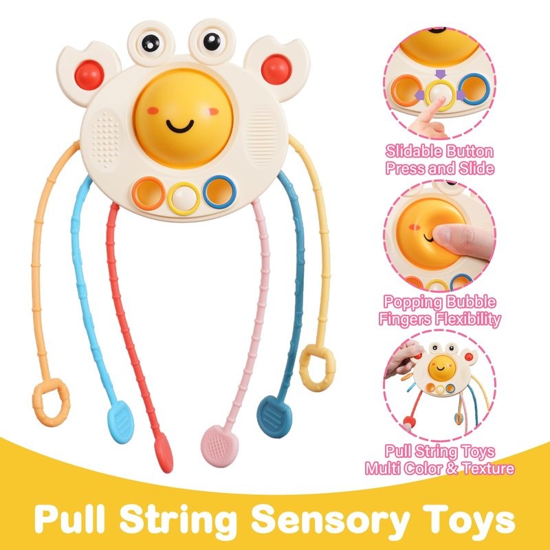 - Pull String Teether Toy: This baby teething toy is designed with 6 silicone drawstrings of different colors and thicknesses, by pulling up and down silicone ropes, pressing and pushing buttons, babies can develop their motor skills and sensory perception